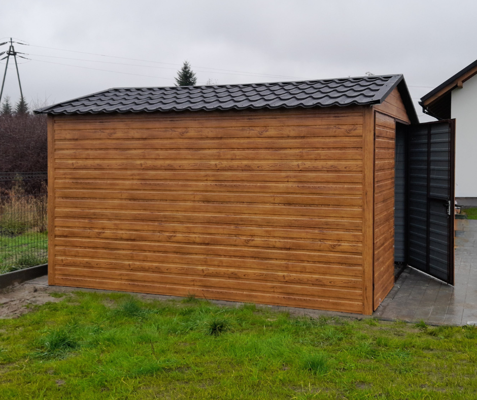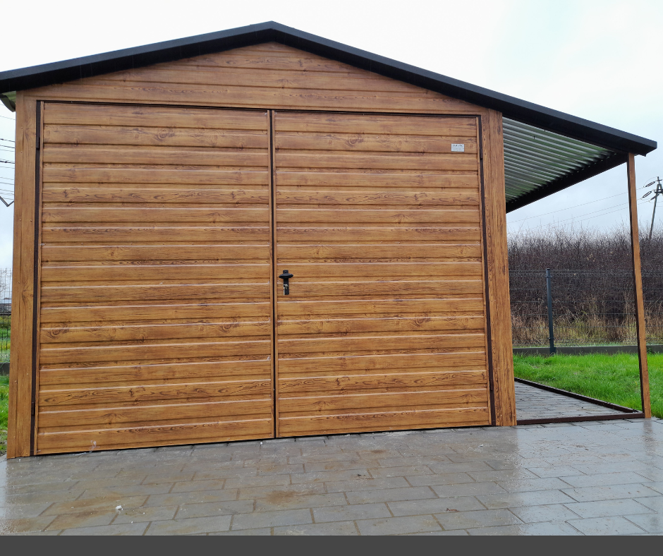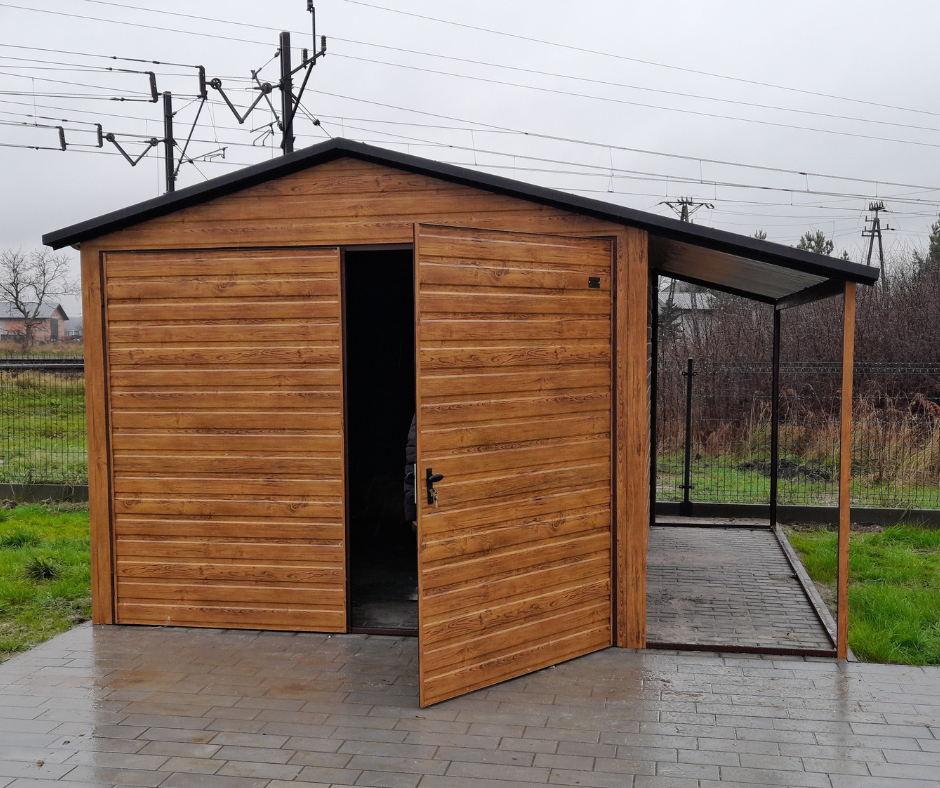 Blaszany domek ogrodowy 3×4 + 1m wiaty otwartej z prawej strony | drewnopodobny MULTIGLOSS + czarna blachodachówka RAL9005