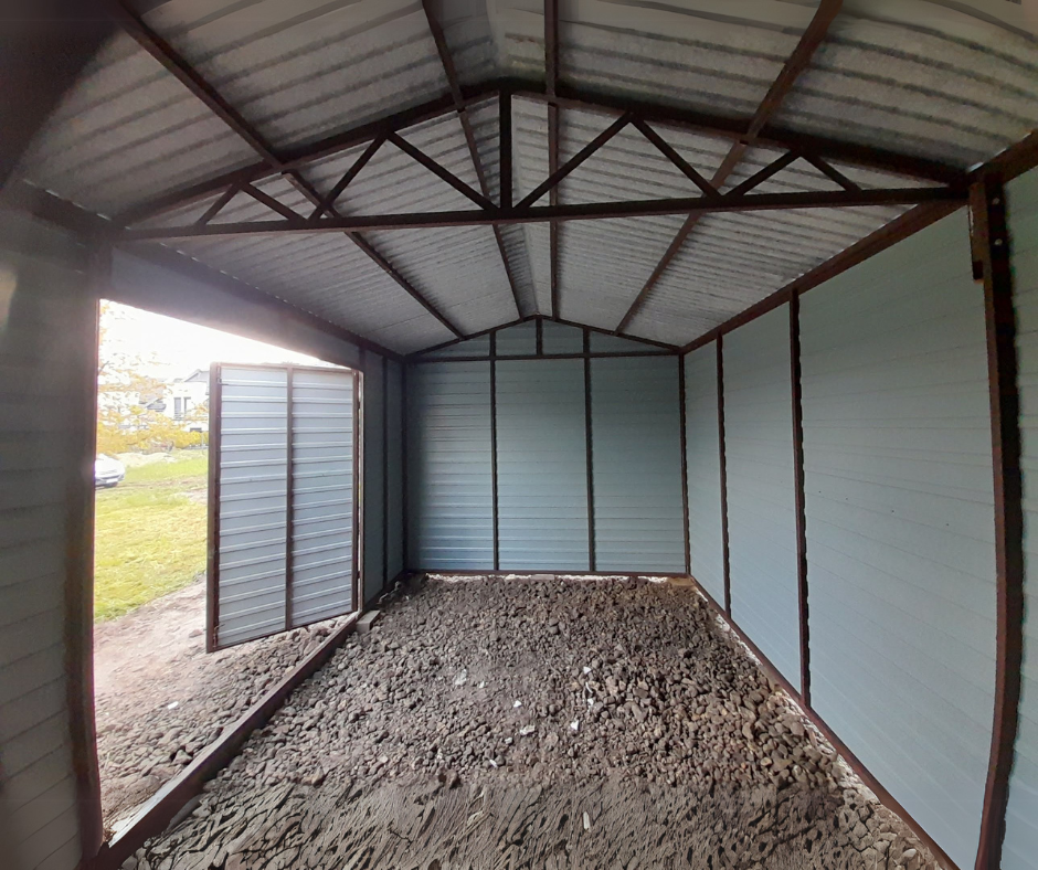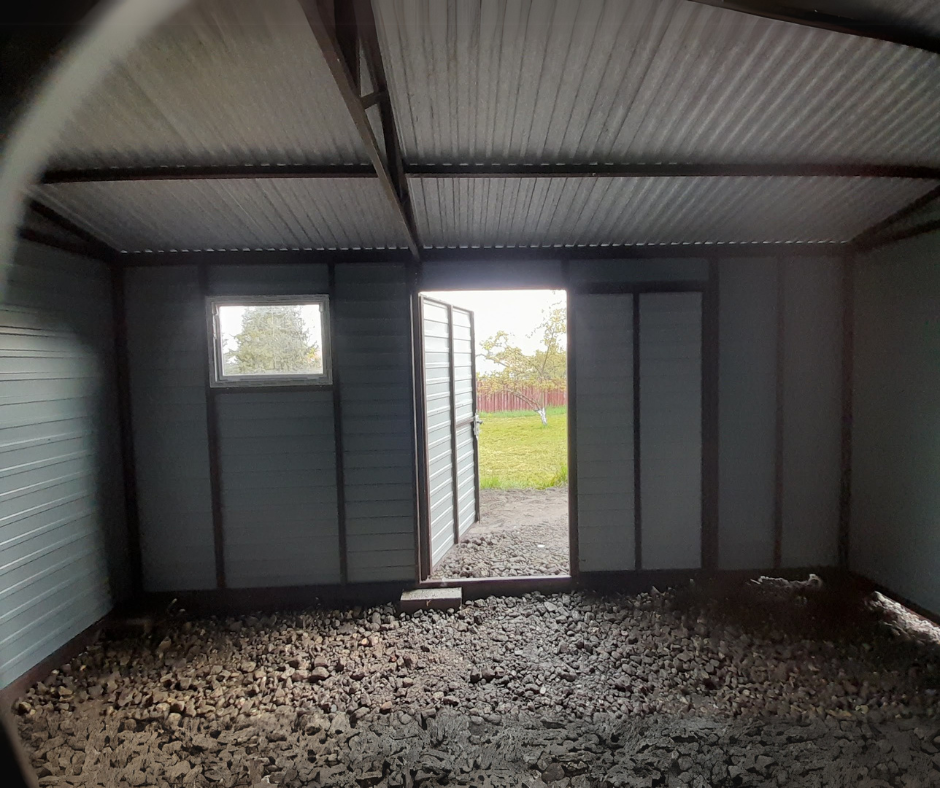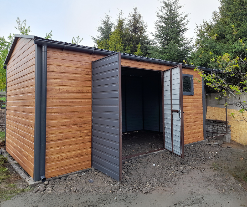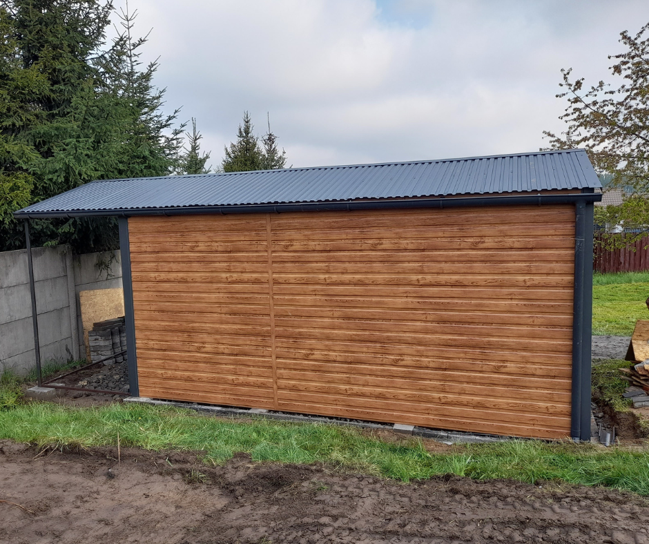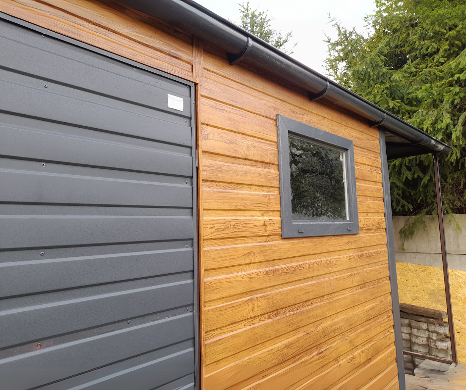 Domek ogrodowy dwuspad przód/tył 5×3 + wiata otwarta 1,5m z prawej | PROFIL ZAMKNIĘTY | kolor drewnopodobny Multigloss + RAL7016 brąz mat + podwyższony pod rynny + RYNNY + FILC