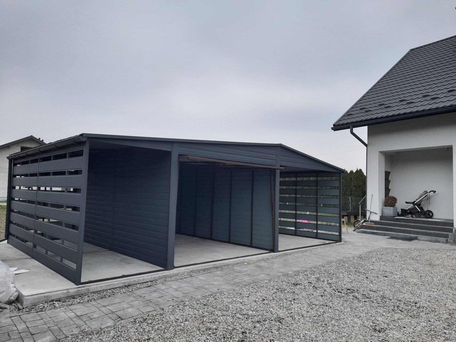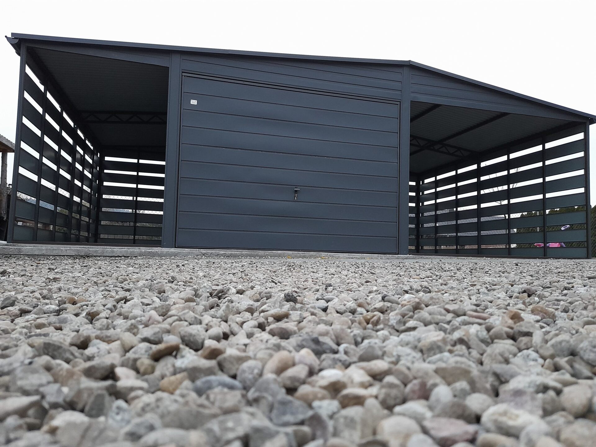 Garaż blaszany 3×4,70 spad na lewo | wiata panelowa 1,5m z lewej + wiata panelowa 3m z prawej | grafit/antracyt RAL7016MAT