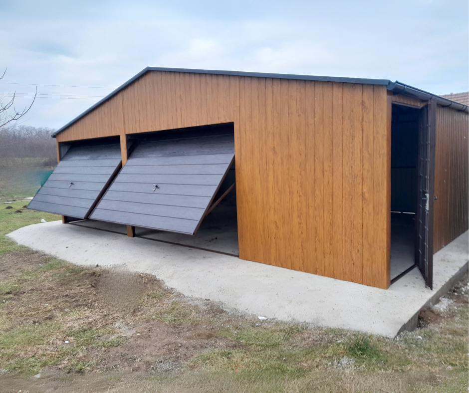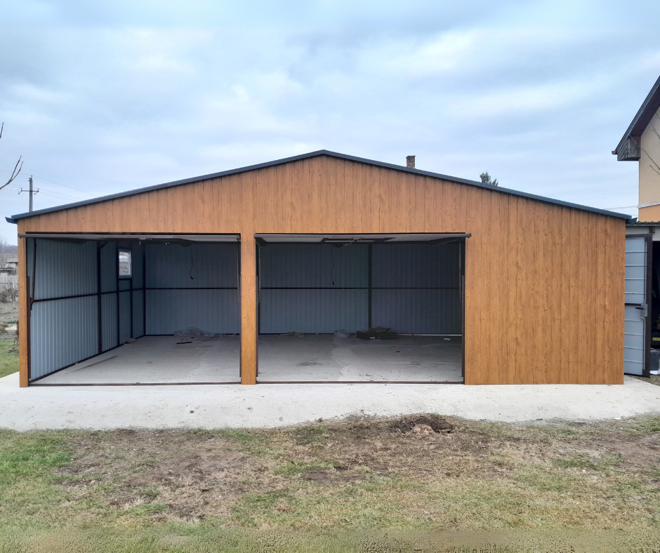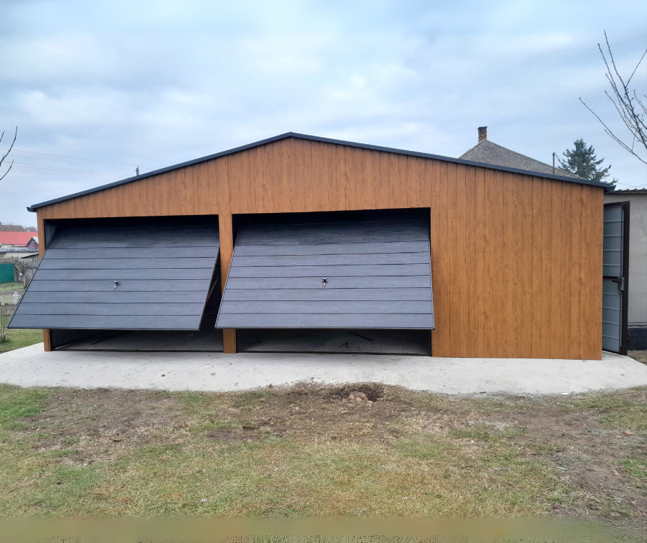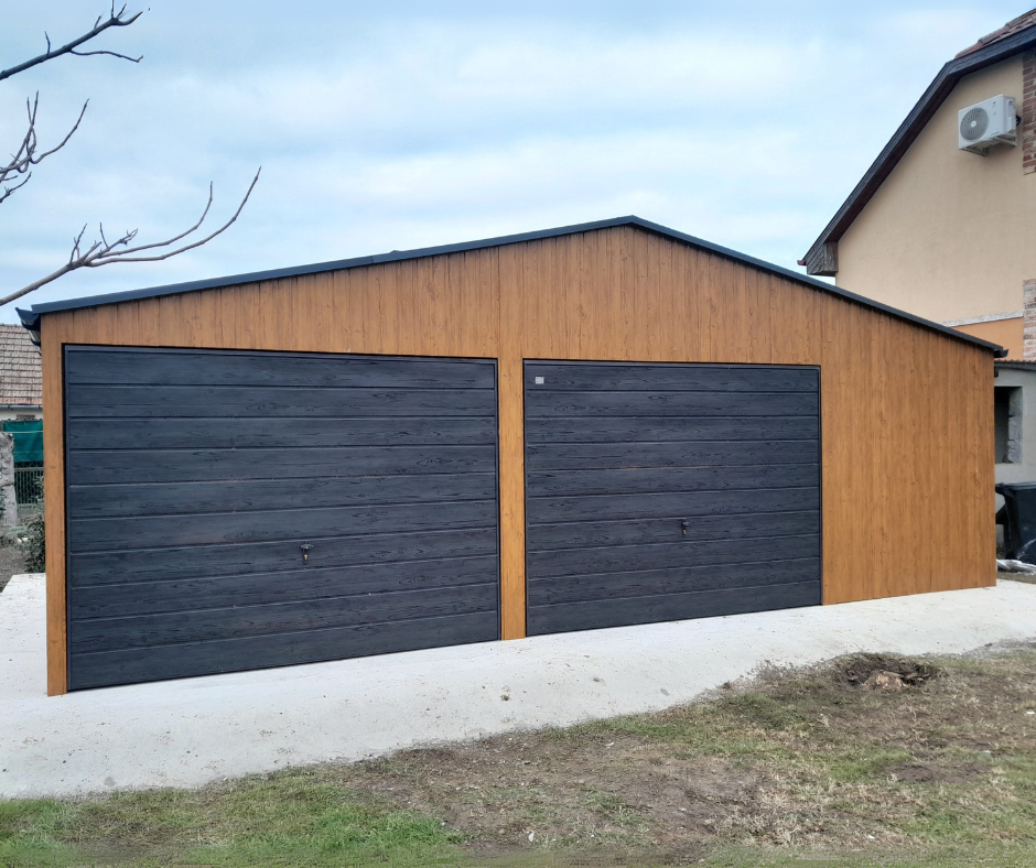 Garaż blaszany dwuspadowy podwójny | PROFIL ZAMKNIĘTY | 8×5,5 m | 2 bramy uchylne z AUTOMATAMI | złoty dąb multigloss +RAL7016 grafit/antracyt | FILC | RYNNY