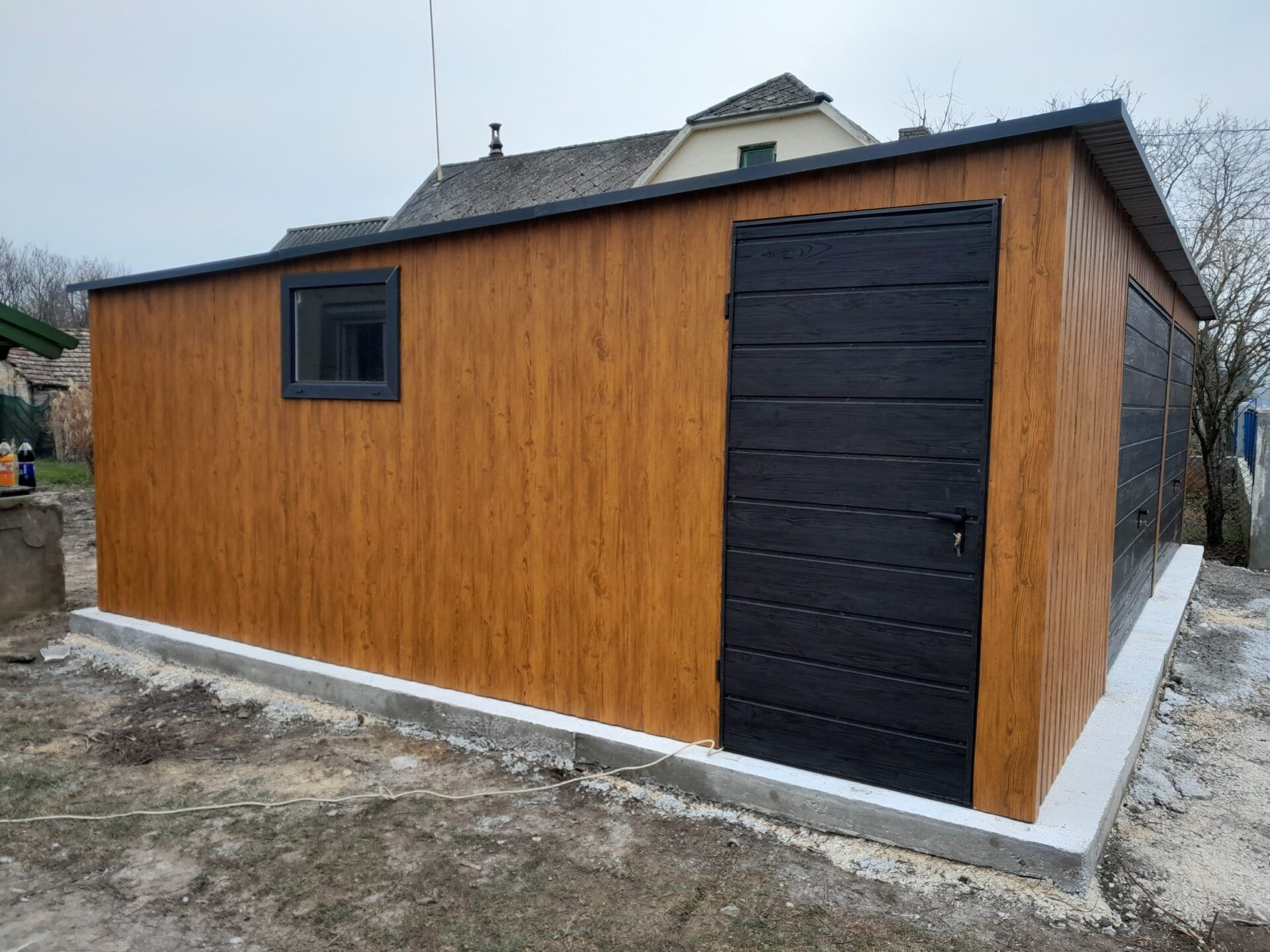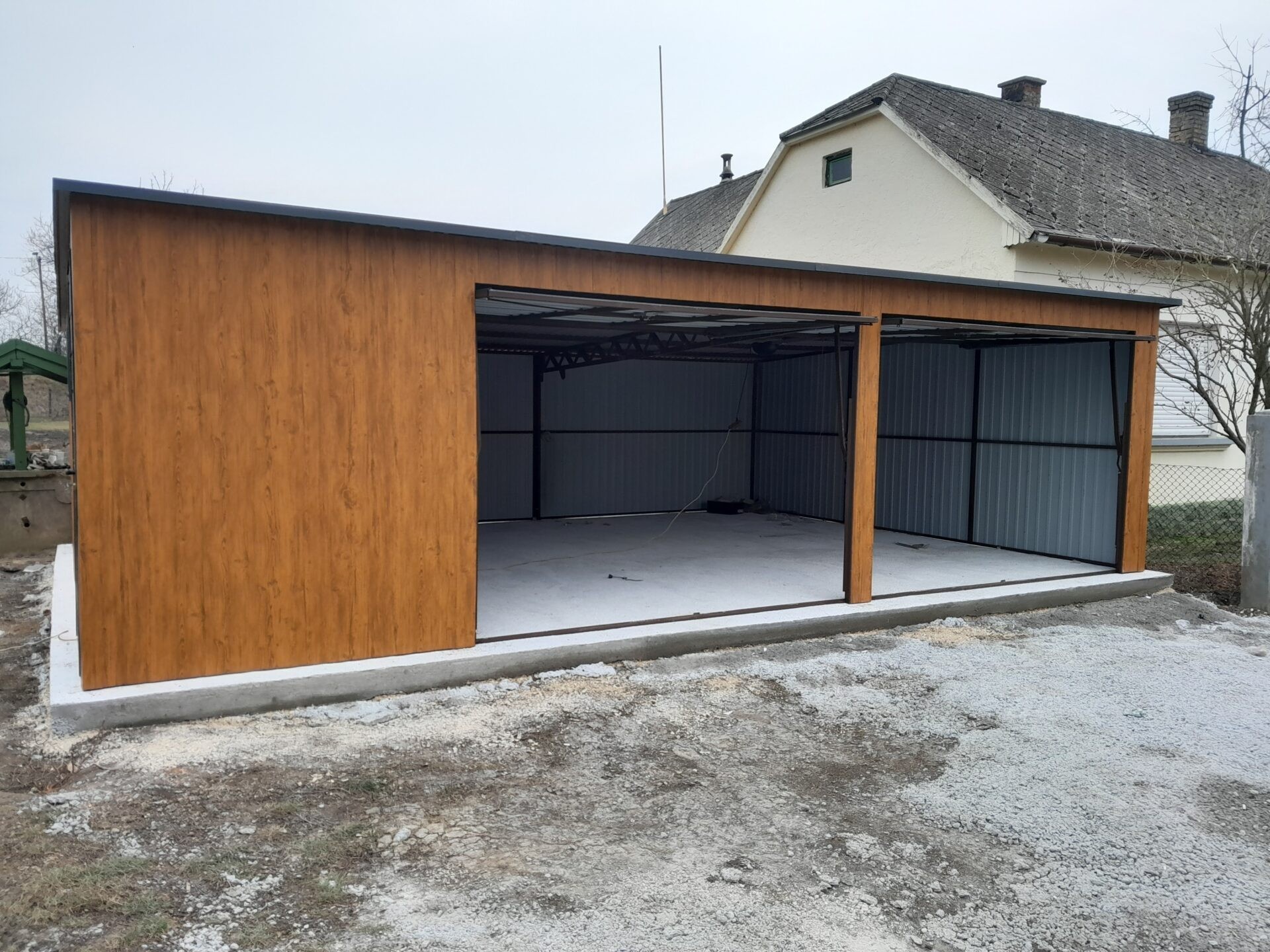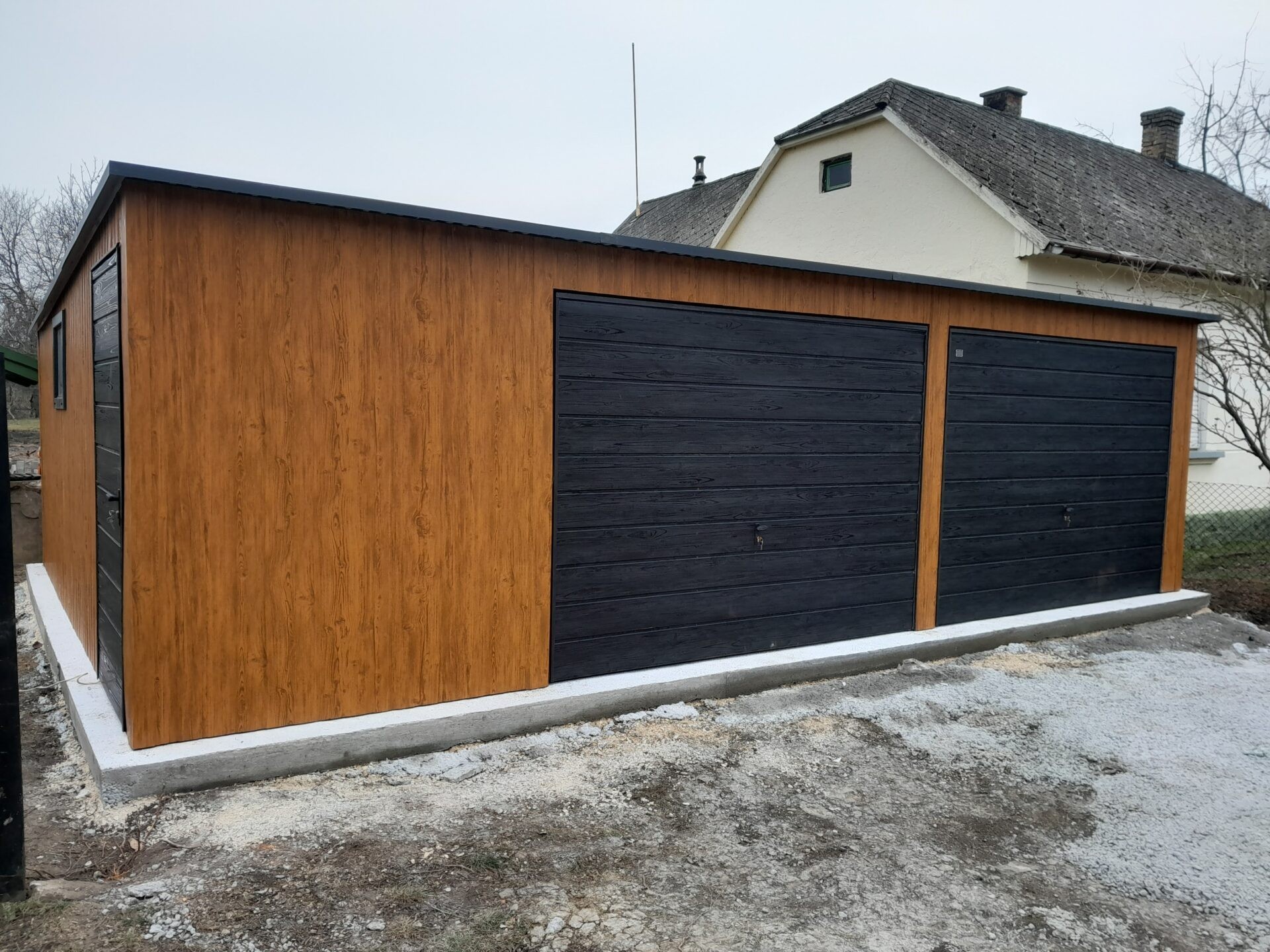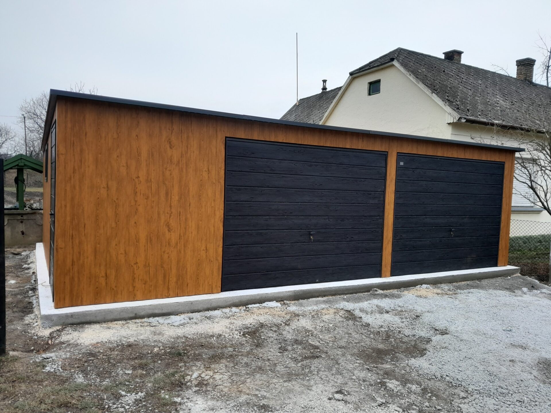 Garaż blaszany podwójny | PROFIL ZAMKNIĘTY | 8×5,5 m | drewnopodobny multigloss +drewnopodobny grafit/antracyt | poodwyższony pod automat